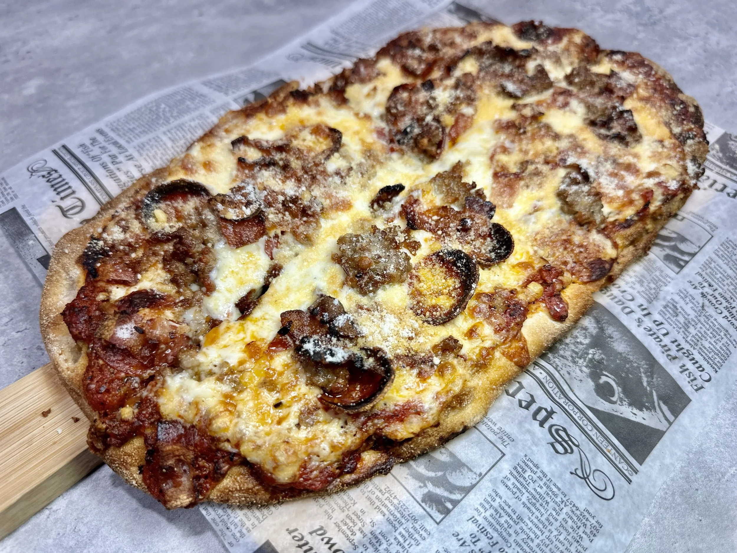 Close-up of a cheesy bacon and sausage pizza on a wooden peel, resting on newspaper.