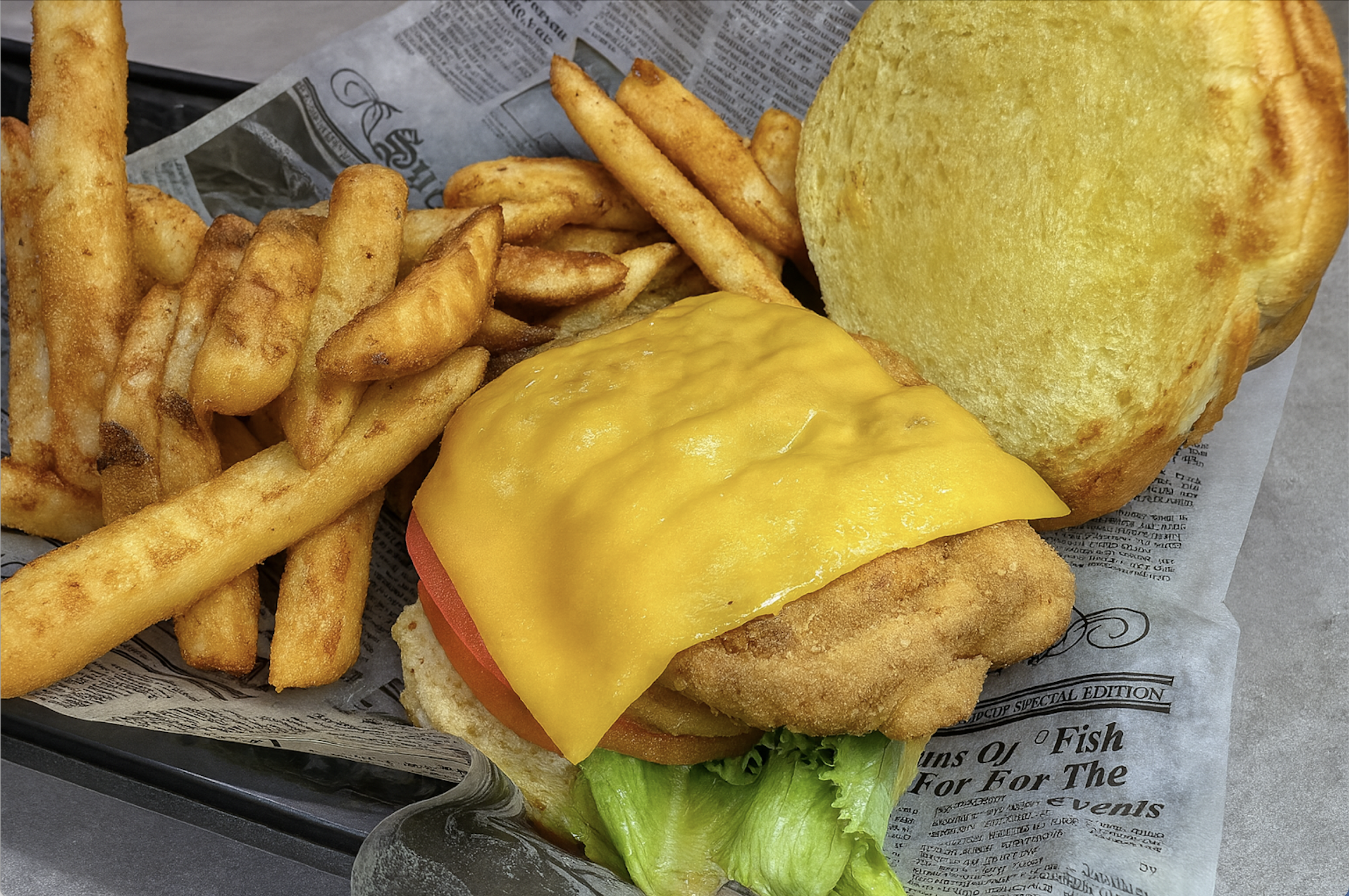 Fried fish sandwich with melted cheddar cheese, tomato, lettuce on a bun, served with French fries on newspaper-style paper.