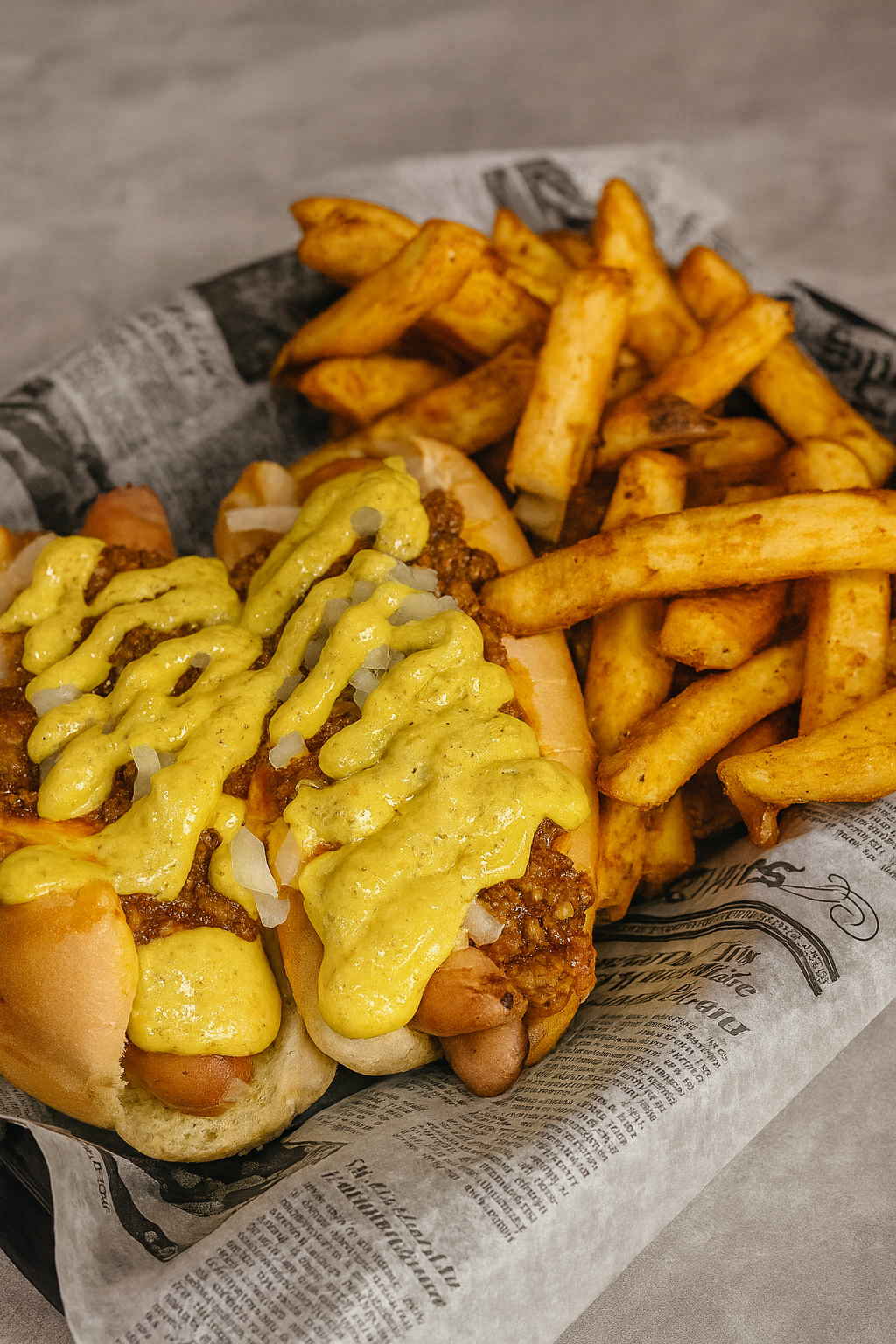 Hot dog with mustard and onions served with seasoned French fries on newspaper-style paper.