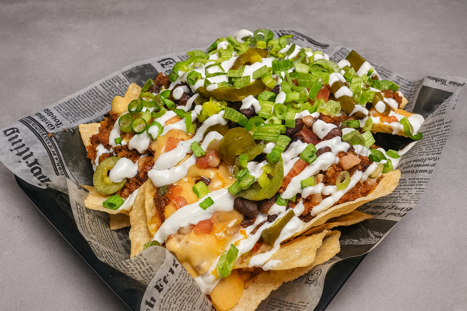 Loaded nachos topped with shredded cheddar cheese, chopped green onions, and grated cheese in a black food tray lined with newspaper style paper