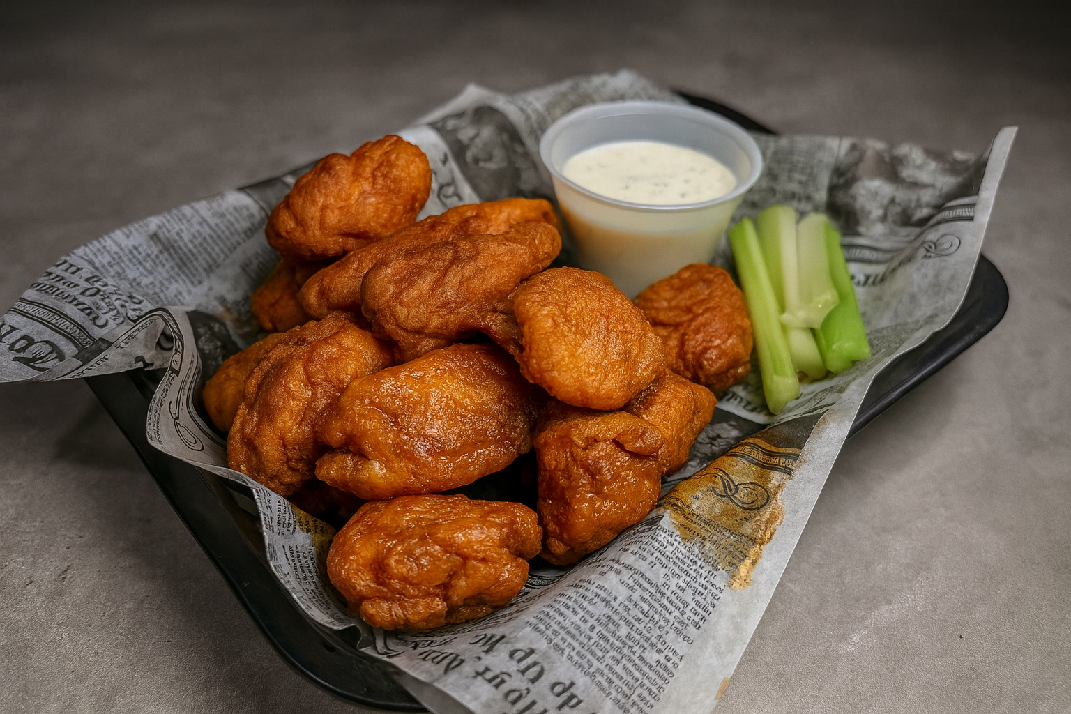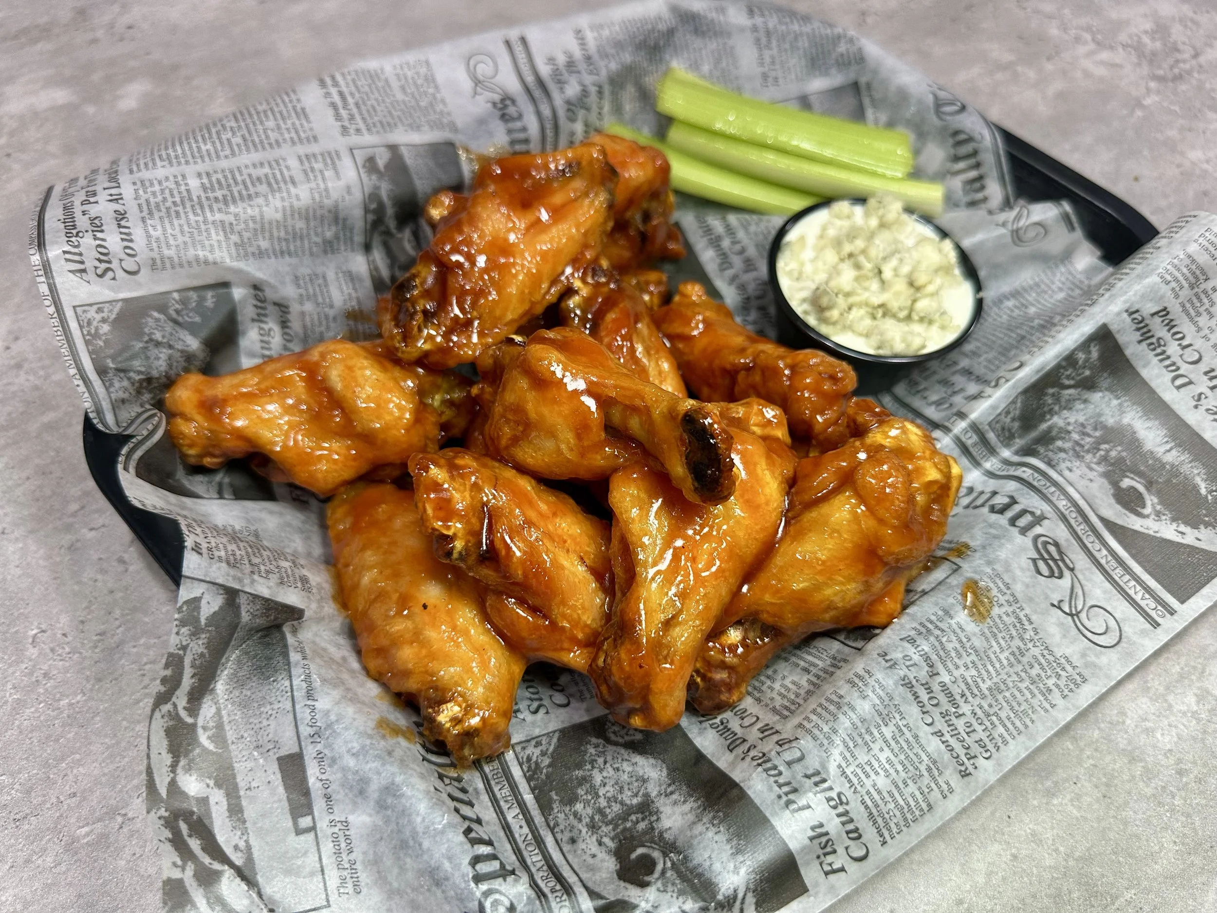 Basket of buffalo chicken wings with celery sticks, blue cheese dressing, and newspaper-style paper lining the basket.