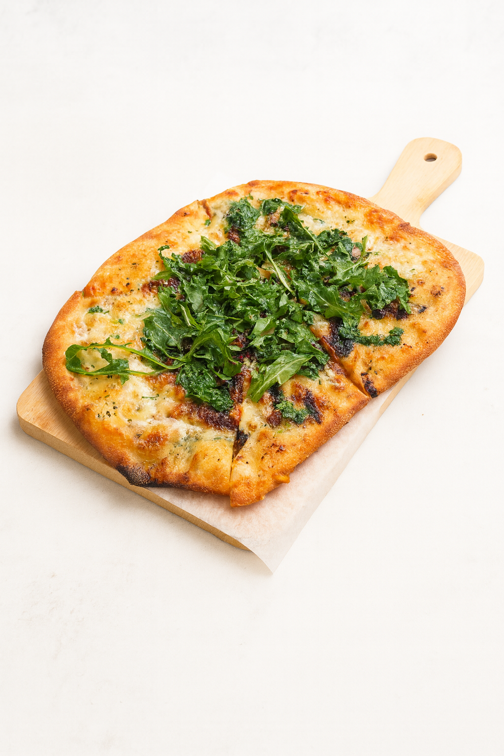Rectangular pizza with cheese and leafy greens on top placed on a wooden pizza paddle.