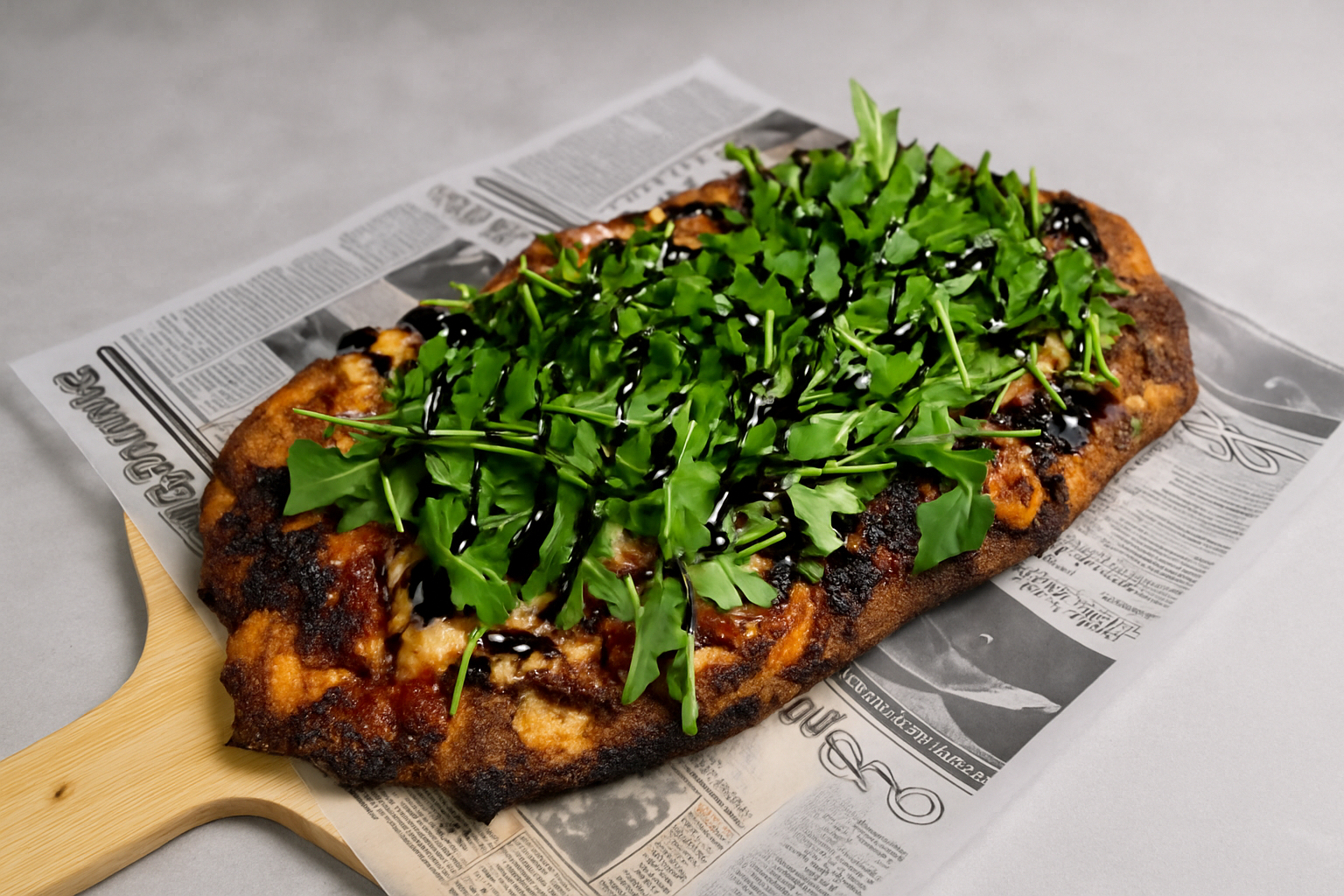 A large rectangular pizza topped with fresh arugula and drizzled with balsamic glaze, placed on a wooden pizza peel over newspaper.